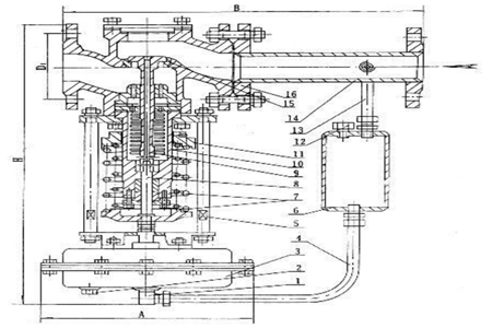 自力式調節閥是主要控制閥后壓力大小的一款閥門,閥門的作為方式為壓閉型。原理如下:介質按照箭頭的方向流過閥體,并在閥芯、閥座受到節流后輸出。此外過蒸汽是由冷凝器冷卻溫度之后。壓力被引入執行器并作用在在隔膜上,使得閥芯相應地移位,從而達到降低壓力的目的。閥后設定壓力增加后,作用在隔膜上的力增加,壓縮彈簧,驅動閥芯,減小閥門開度直到閥門壓力下降到設定值。類似地,如果閥后面的壓力減小,則作用在膜片上的力減小,并且彈簧的作用力強制彈起,驅動閥芯,使閥門開度增大,直到閥門壓力上升到設定值。
